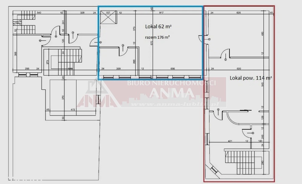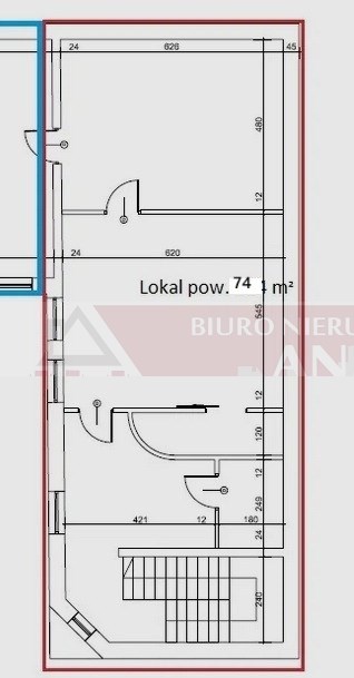 Lokal składa się z pomieszczenia biurowego o powierzchni 64m2, aneksu kuchennego, WC a ponadto klatki schodowej, którą można zaadaptować na kolejne pomieszczenie biurowe.