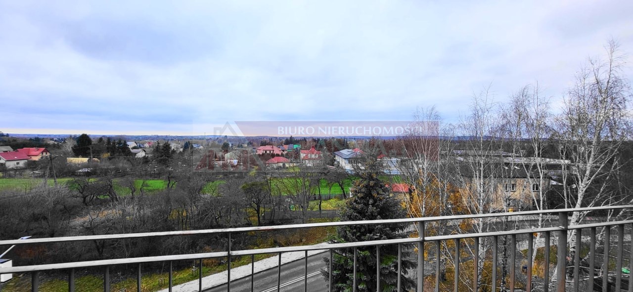 Przy większym pokoju jest duży balkon z widokiem na tereny zielone. Na podłogach jest wykładzina z PCV a w łazience - płytki.