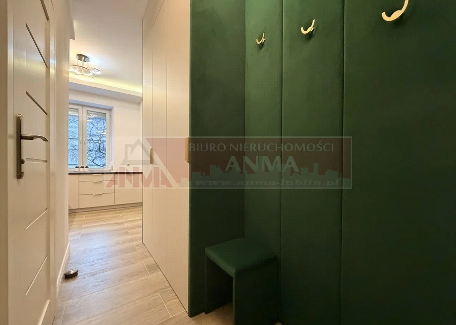 W przedpokoju znajduje się pojemna, wysoka szafa a w strefie wejścia - wykończone szmaragdowym aksamitem miejsce na garderobę wierzchnią z siedziskiem.