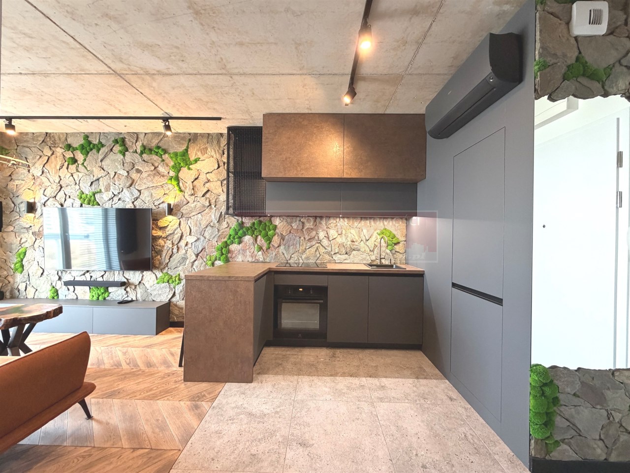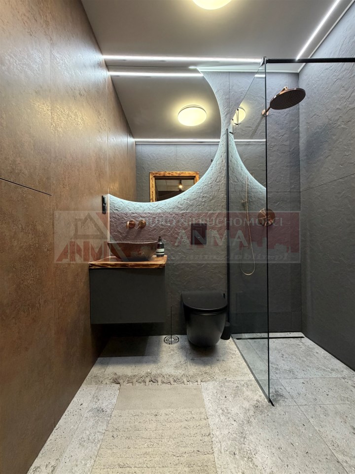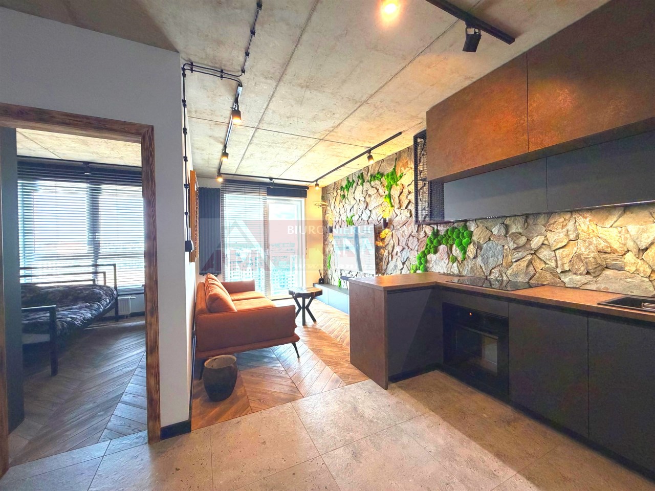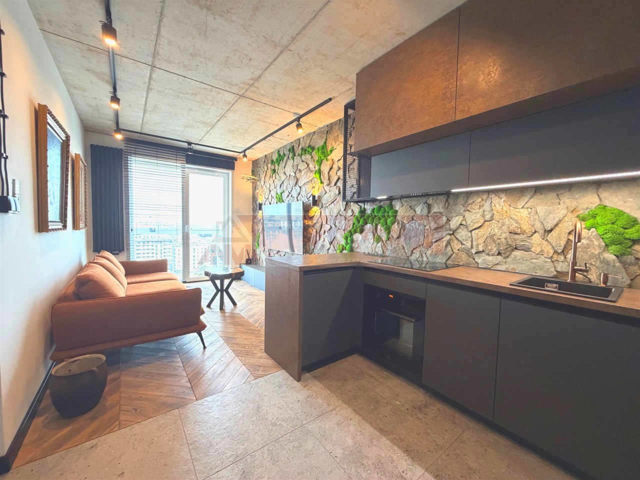 Uwagę przykuwa już od wejścia dekoracyjna ściana wykończona łupkiem i mchem. Loftowe oświetlenie rozprowadzono po betonowym suficie. Miedziana armatura ładnie harmonizuje z kolorem baltów i okładzin szaf. Okna z PCV można przesłaniać drewnianymi żaluzjami.